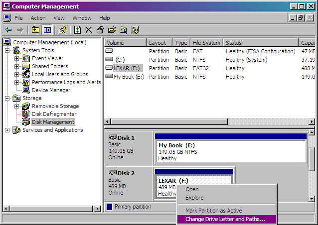 - In this instance I am going to change the drive letter of my Lexar USB drive. Right-click on the drive in the list, and from the resulting menu select “Change DriveLetters and Paths…”